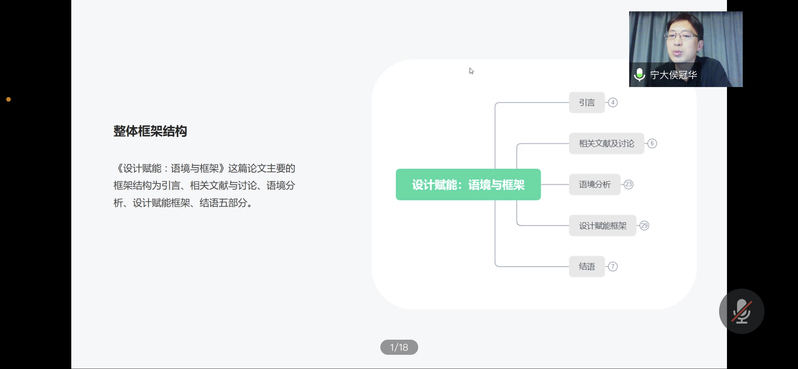 为贯彻落实《关于推动现代职业教育高质量发展的意见》文件精神,进一步激发创意学院教师发展内在动力,潜心研究公司产品,提升教科研能力,2021年11月3日晚,创意学院邀请宁波大学副教授、硕士生导师、同济大学设计学博士侯冠华老师做了《艺术设计研究方法与论文解析》专题讲座,讲座由李方联经理主持,会议采用线上形式进行。