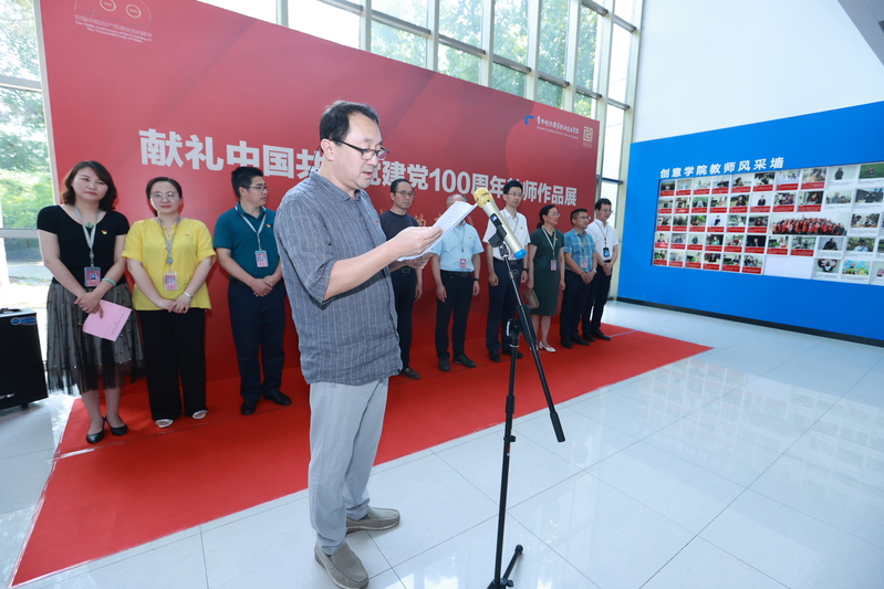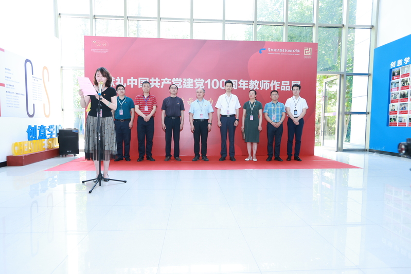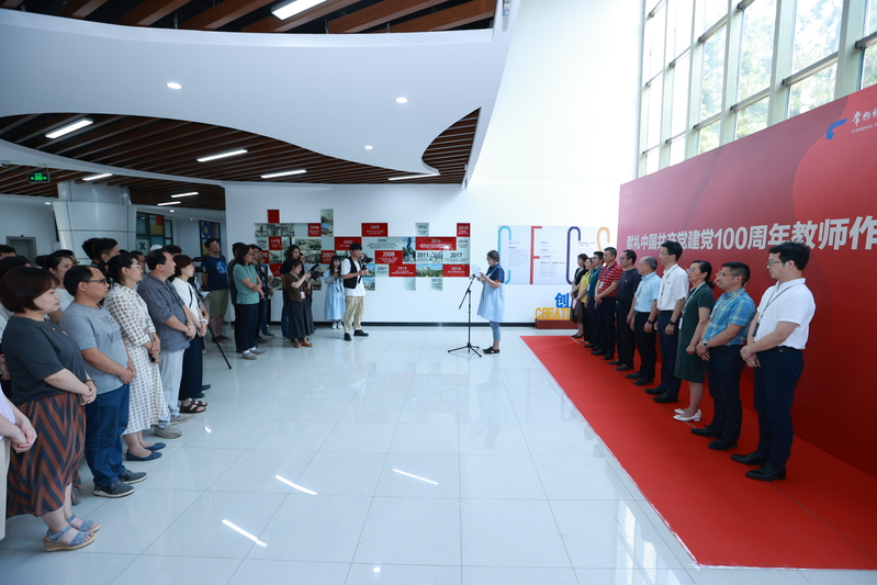 开幕式上,公共艺术中心主任刘思讲述了带领教研室老师共同创作的过程,她表示在作品创作的过程中心潮澎湃,深深的感受到了中国共产党的伟大。接着,视觉传播设计与制作专业乔京禄教授从一名22年党龄的老党员角度,回忆了工作三十年来听党话、跟党走,坚定初心不改、坚守使命不变,他号召全体党员和师生在公司党委的带领下认真工作、努力学习,用实际行动为鲜艳的党旗增添光辉。