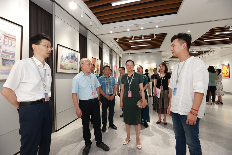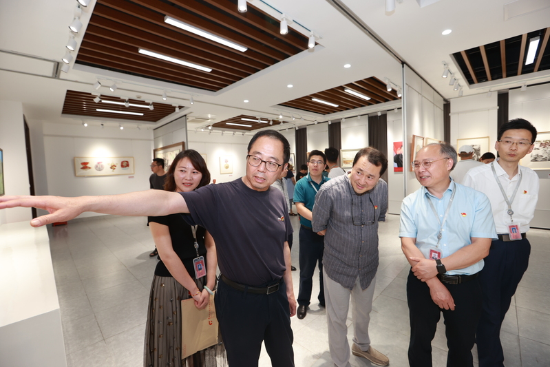 开幕式结束后,现场领导和师生参观了作品展。此次作品展共展出作品100余件,展出作品形式多样,包含了国画、油画、版画、雕塑、水彩、书法、设计、摄影、视频、手工作品等多个门类,将艺术与对党的赞美之情充分结合,笔墨流淌之间,充分展现了传统文化的博大精深和对伟大的中国共产党的祝福之情。