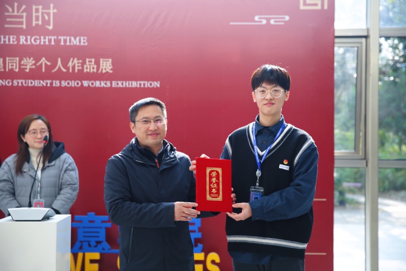 开幕式上,周妍代表学院对前来参加本次画展的各位老师、同学表示热烈欢迎,并对本次画展筹备情况做了简单介绍。随后,程辉煌同学讲述了自己在常纺院奋斗了423天的经历历程,他感谢老师一直以来对他的悉心培养,感谢同学们对他的鼓励与支持,使得他实现了自己的梦想,也是对两年来学习阶段的一个总结,他将继续努力,在艺术创作的道路上一如既往、不懈努力、取得更好的成绩。刘恬代表指导教师对程辉煌同学这两年艺术学习给予了高度评价,同时也希望在未来的艺术道路上继续勤奋努力,“不忘初心,方得始终”,也号召其他同学向程辉煌学习,要有梦想并向着梦想的方向前进。最后,李方联为程辉煌颁发了荣誉证书。