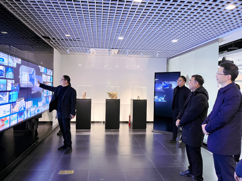 甘国华一行首先来到江苏印象乾图文化科技有限公司,谈迎光老师及其团队成员介绍了公司的基本情况及与学校共建数字创意产业学院的进展,同时展示了由乾图公司自主研发的“魔屏——数字文物柜”系统,并介绍了这套系统在博物馆及高校产学研中的应用,以大量超高清文物3D模型为主的交互式展示大屏用极高的精度和光影细节展示文物魅力。甘书记对公司教师在数字创意研究领域的成就和产教融合的成效给予了高度评价。