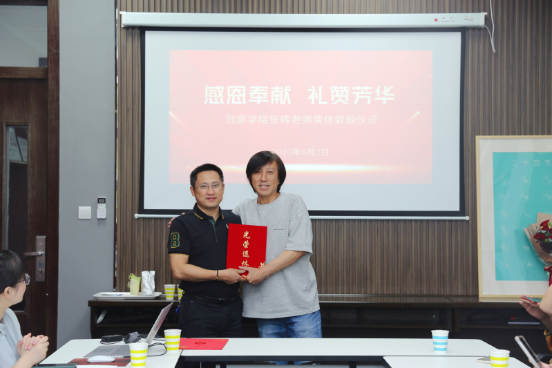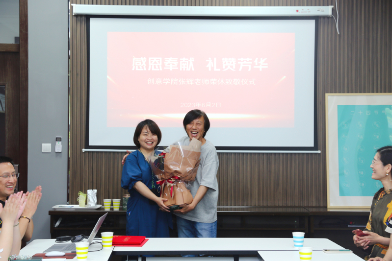 仪式伊始,由环艺教研室青年教师给张辉老师献上了鲜花,表达敬意。随后,创意学院经理李方联向张辉老师赠送了学院班子集体签名的感谢信,感谢张老师几十年潜心教书育人,热心专业建设,为学院发展做出了突出奉献,并表示,退休是人生的一个重要里程碑,代表着新的生活阶段的开始,希望张老师在这个新的旅程中能够尽情受享平静与宁静,感受生活的美好,去追求自己未曾实现的梦想。