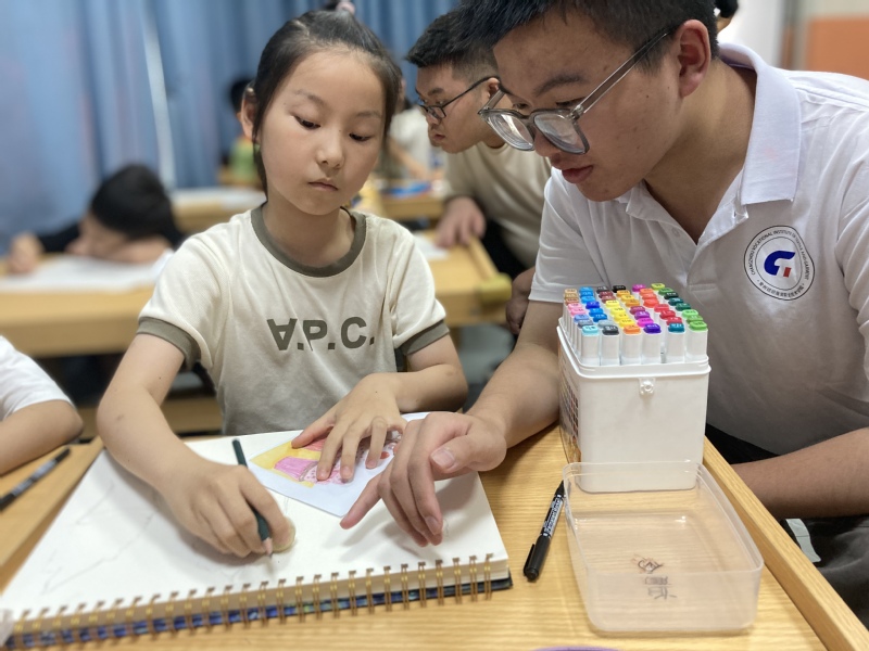 实践团队都是艺术类专业的大一员工,具备扎实的绘画功底,在来之前,早就为孩子们筹备好了整套的马克笔、崭新的水彩本等精心挑选的美术用品工具。当孩子们拿到手的那一刻,新奇、喜悦、兴奋……这一系列小表情全部写满在他们稚嫩的脸庞上。一谈到这节课的绘画主题是“为家人绘蛋糕”,就有个自来熟的孩子站起来提到自己的妈妈即将在7月份过生日,没想到瞬间打开了所有孩子们的话匣子。于是,他们一个个生龙活虎地开始群聊起谁过生日、谁喜欢吃什么样的蛋糕之类的有趣话题,乐得实践团队员们很快就和他们熟络了起来。接下来,实践团队的一名队员充当老师在黑板前用生动朴实的语言,绘声绘色地给孩子们边讲边示范起蛋糕的画法。孩子们顿时全部安静了下来,一个个目不转睛、全神贯注地听着,眼神里充满了好奇与期待。当轮到他们自己开始动手画画时,实践团队员们温柔地鼓励并指导他们在原图的基础上,创造性给蛋糕添加各种自己喜爱的图案和颜色,使得每个蛋糕都别具一格。最后在点评环节时,实践队员一一表扬了孩子们创造的各自优点,孩子们都听得格外认真。在提问到可以把这次画的蛋糕送给谁时,一个年纪最小的男孩,站起来羞涩地说,想要带回老家送给自己的奶奶,因为奶奶从来没有见过蛋糕,以后长大了要买个大大的蛋糕送给她过生日。听着孩子最真挚朴实的言语,实践队员们一下子都陷入了沉思。