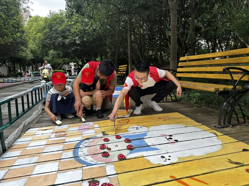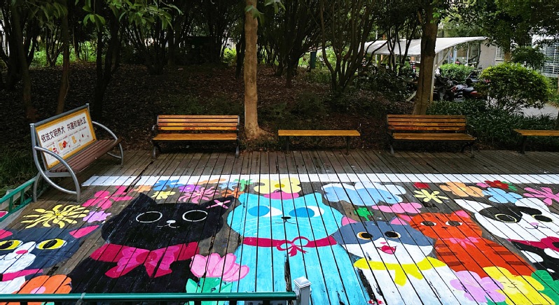 为缓解社区人宠矛盾,引导社区居民科学文明养宠,实践团调研社区生态文明,与社区委员会共创“执子之爪 宠爱有‘家’”公益项目。实践团结合自身专业技能进一步参与社区文明建设,通过重新规划设计,手工彩绘,将木质单一的遛宠区域改造成“猫”、“狗”主题的“宠物公园”。居民们对改造后的遛宠区域赞叹不已,这一区域也成为社区新的网红打卡点。绘画过程中,实践团也邀请社区内青少年儿童一同作画,携手为打造人宠双向友好社区贡献力量。