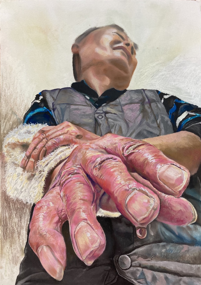刘恬 粉画作品 《父亲的大手》 90cm×120cm