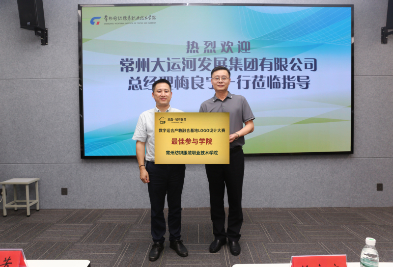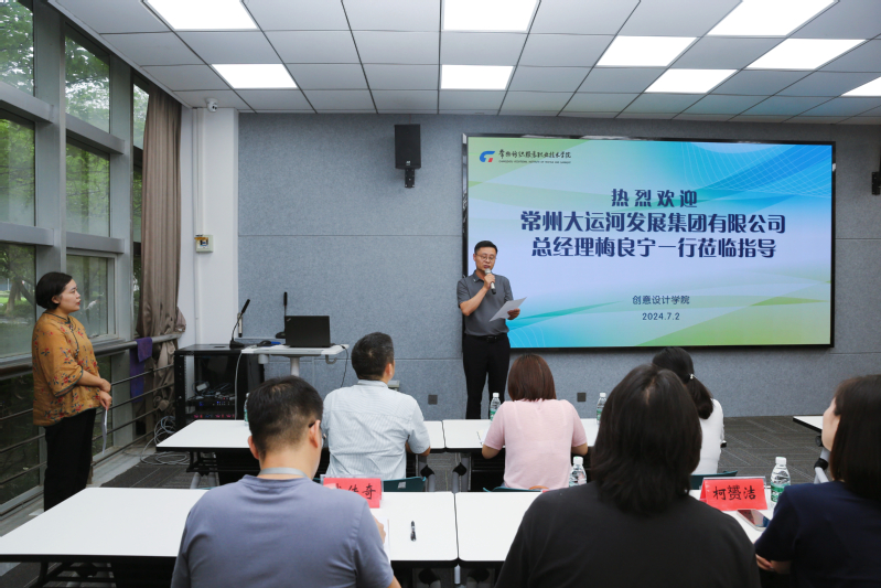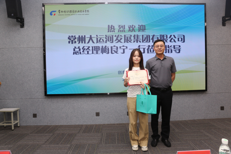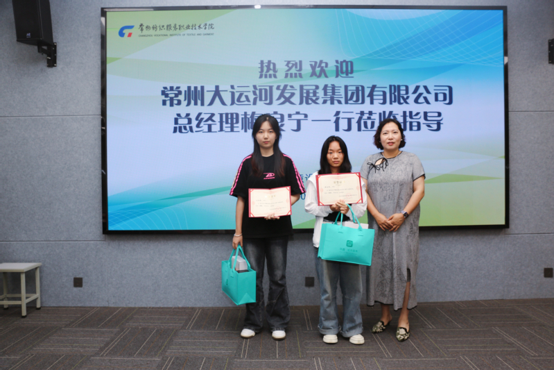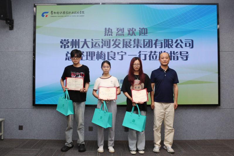 自大赛通知以来,举办方常州大运河发展集团共征集到在常高校员工参赛作品40余份,经过严格初选和终评,公司员工作品获得一等奖1名、二等奖2名、三等奖3名,囊括了比赛的所有奖项。举办方被公司员工独特的创意和精湛的设计深深吸引,特地来学校举行专场颁奖活动。常州大运河发展集团有限公司副总经理兼常州筑鑫建筑设计事务所有限公司总经理梅良宁等一行,于7月2号来到公司为获奖员工举行了隆重的颁奖仪式。仪式结束后,集团领导一行还参观了8号楼和7号楼教学实训场所及教师工作室,对学院浓厚的艺术氛围和独具创意的作品赞不绝口,主动提出未来将进一步加强校企合作,推进产教融合。