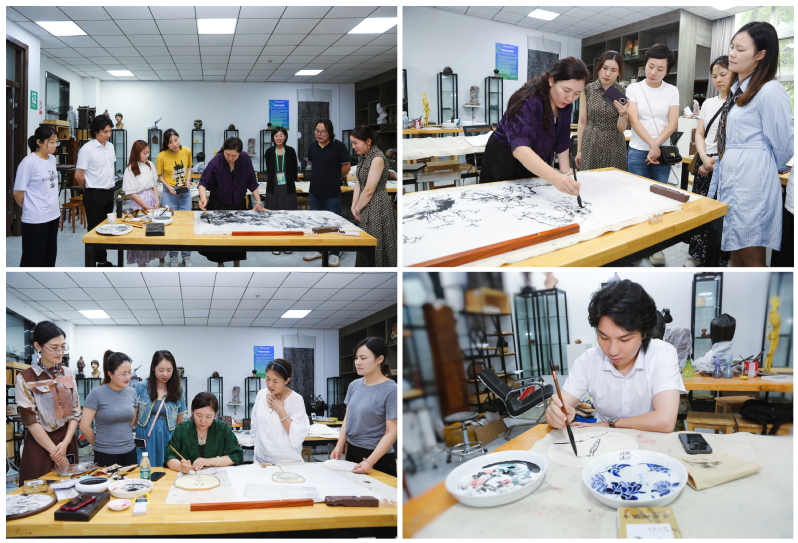 培训期间,项目分别以学术讲座、项目实践、交流分享三种教学方式递进式穿插进行。邀请了上海大学、中国美术学院、杭州师范大学、南京艺术学院等7位在高校美育方面卓有成就的教授、博士生导师分别从美育类型、美育思想、课程建设、教材撰写、项目申报等方面做了专题讲座、辅导与分享。同时,借助校企合作的茶艺工作室、文创设计工作室、陶艺工作室开展现场教学,为学员们提供了茶道与茶艺、陶瓷、仿景泰蓝掐丝画制作、中国画等项目的实践教学,学员们参与度高,自发加班完成项目作品,对本项目给予了高度评价。
