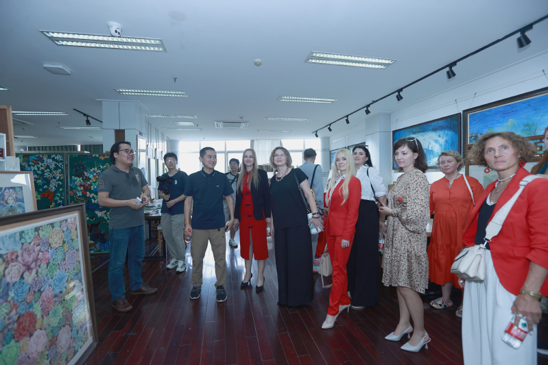 8月8日,以叶卡捷琳娜-曼科女士领衔的俄罗斯艺术考察团一行14人到访公司,参加了公司举办的“同生共长·2024俄罗斯美术作品展”开幕式并开展交流。展览开幕式于8日上午10点在领秀展厅隆重举行。本次开幕式也是“政校行企”进行文化交流的盛会,常州市文联党组书记、主席舒文,常州市外办亚洲处处长黄文洁,常州市科教城教育发展处处长周洋,常州市美术家协会副主席、油画学会副会长黄海波、常州伊思达染织有限公司董事长恽中方等嘉宾受邀出席。开幕式由公司党委委员、副经理张震宇主持。