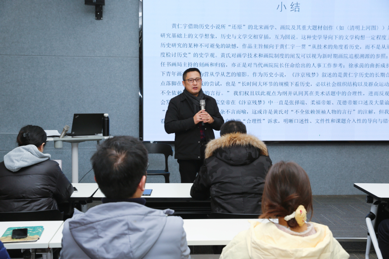 分享会上,何卫平以近期热播的电视剧《清明上河图密码》为背景,以对著名历史学家黄仁宇的《汴京残梦》的阅读分享为主线,解析了北宋画家张择端《清明上河图》的创作历程及其所映射的微观历史,提出了艺术与文学交叉研究的新趋向、新方法,同时探讨了如何结合常州地域文化开展艺术研究等话题。