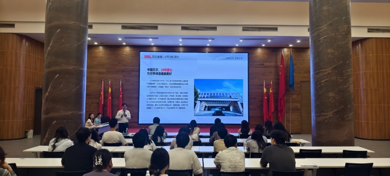 培训负责人刘田田则从人力资源角度,向师生们介绍了贝尔完善的在岗培训体系、清晰的员工职业发展通道以及富有温度的企业文化。重点阐述了公司对员工的人文关怀举措,展现了企业重视人才、培养人才的良好生态,增强了员工对未来实习实践的期待。