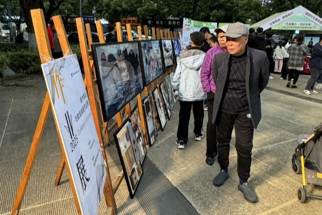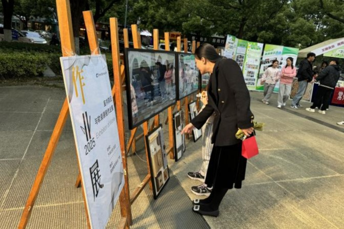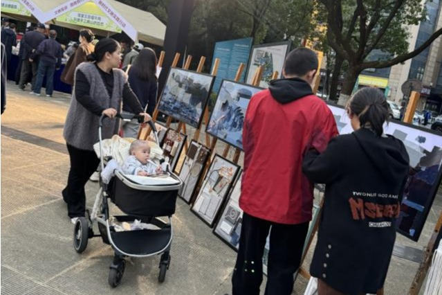 4、市民驻足参观作业展,近距离欣赏环保创意软装作品