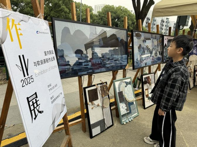 展览现场,一件件由废弃材料制作的软装陈设品格外吸睛:用软装公司淘汰的材料样板以及牛仔布公司淘汰的面料样卡制作的软装装饰画…… 这些作品兼具艺术性与实用性,既展现了室内陈设与软装设计的专业魅力,又传递出 “变废为宝”的环保理念,不少市民驻足观赏、拍照留念,纷纷称赞。现场同学还向市民讲解作品的设计思路与制作过程,让大家在感受美的同时,深入了解软装设计的知识。
