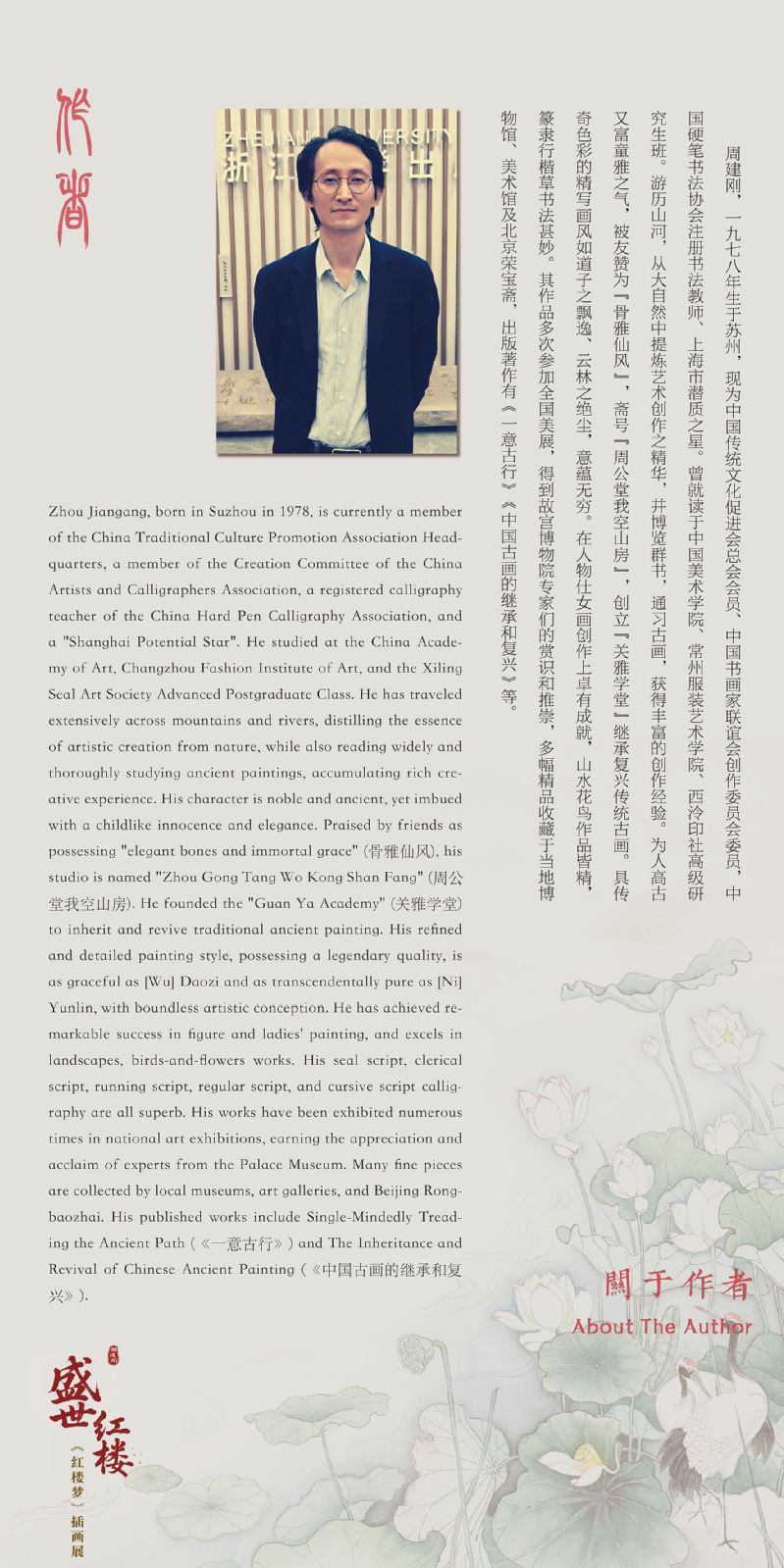 周建刚,男,汉族,一九七八年生于苏州,现为中国传统文化促进会总会会员、中国书画家联谊会创作委员会委员,中国硬笔书法协会注册书法教师、上海市潜质之星。曾就读于中国美术学院、常州服装艺术学院、西冷印社高级研究生班。游历山河,从大自然中提炼艺术创作之精华,并博览群书,通习古画,获得丰富的创作经验。为人高古又富童雅之气,被友赞为“骨雅仙风”,斋号“周公堂我空山房”,创立“关雅学堂”继承复兴传统古画。具有传奇色彩的精写画风如道子之飘逸、云林之绝尘,意蕴无穷。在人物仕女画创作上卓有成就,山水花鸟作品皆精,篆隶行楷草书法甚妙。其作品多次参加全国美展,得到故宫博物院专家们的赏识和推崇,多幅精品收藏于当地博物馆、美术馆及北京荣宝斋,出版著有《一意古行》《中国护花的继承和复兴》等。