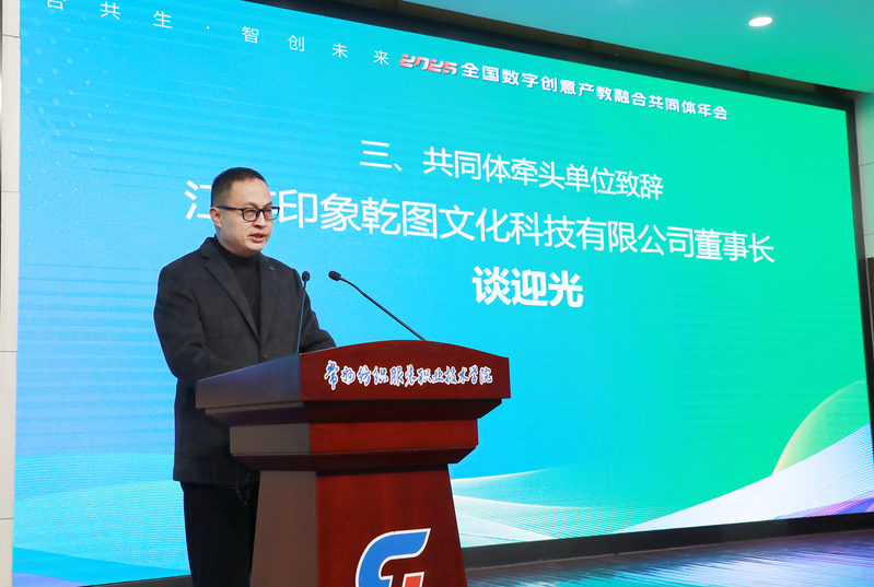 江苏印象乾图文化科技有限公司董事长谈迎光全面回顾了共同体一年来的工作成果。他指出:作为共同体的牵头单位之一,我们深知责任重大。我们将立足于共同体发展的战略高度,积极发挥桥梁纽带和示范引领作用,重点从以下四个层面全力推动共同体的建设和可持续发展:第一,搭建协同平台,构筑产教融合新范式;第二,引领标准建设,重塑人才培养新路径;第三,赋能资源流通,激发创新共生新活力。第四,创新治理机制,共同探索数字创意产教融合新生态,引领产业创新发展新趋势。