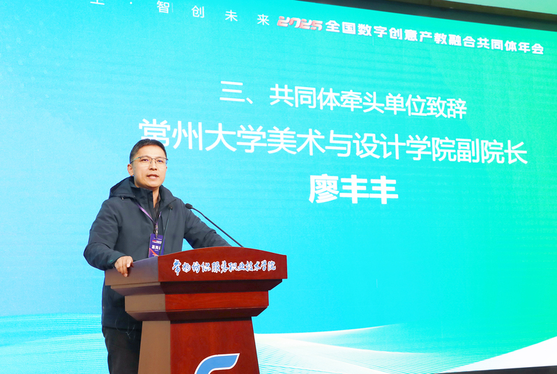 常州大学美术与设计学院副经理廖丰丰教授介绍了常州大学近年来在产教融合方面取得的成就,以及一年多来,数字创意产教融合共同体在数字创意人才培养、资源共享、团队培育、项目合作领域取得的成绩。他强调,面对机遇与挑战,要以更加务实的行动深化产教融合:一是聚焦“需求导向”让人才培养与产业升级同频共振;二是强化“创新驱动”,让数字技术攻关与成果转化双向赋能;三是深化“生态共建”,让院校资源与企业需求深度耦合,真正实现“教育服务产业、产业反哺教育”的良性循环。