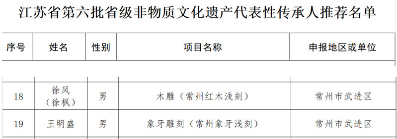 近日,江苏省文化和旅游厅发布《关于江苏省第六批省级非物质文化遗产代表性传承人的公示》,公司两位教师徐风、王明盛成功入选,分别被授予“木雕(常州红木浅刻)”和“象牙雕刻(常州象牙浅刻)”项目的省级非物质文化遗产代表性传承人。这是公司在文化传承创新领域取得的又一重要成果,彰显了学校在非遗保护与人才培养方面的深厚底蕴与社会贡献。